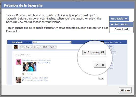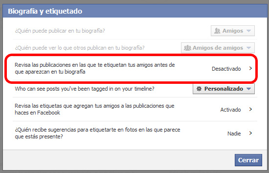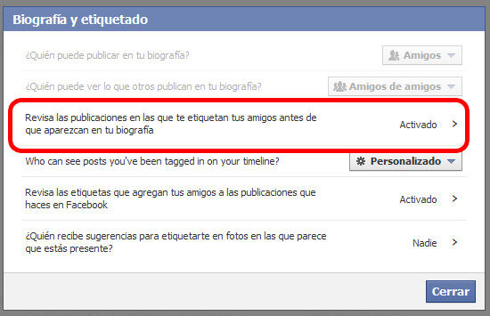5. El menú de Biografía y Etiquetado va a mostrar que ya está Activada la Revisión de publicaciones en las que te etiquetan. Click en Cerrar